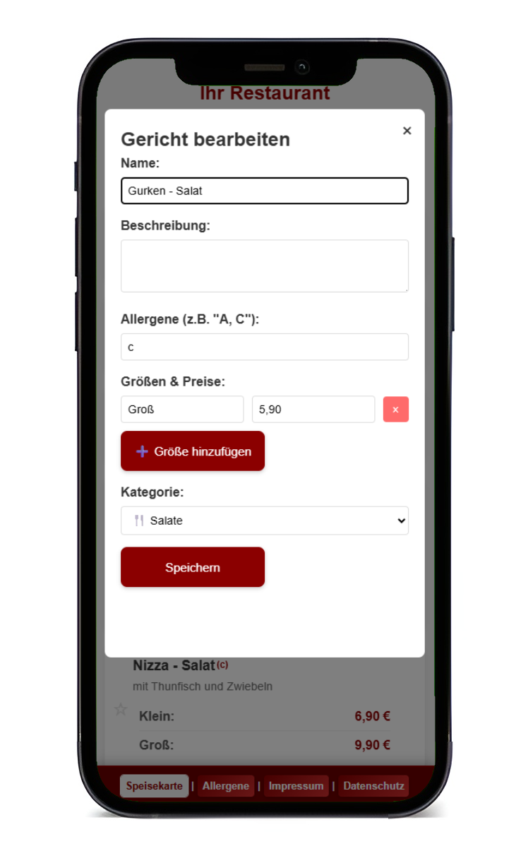 Volle Kontrolle: Als Betreiber können Sie Ihre Speisekarte komplett selbst verwalten – ganz ohne technisches Vorwissen. Gerichte lassen sich jederzeit hinzufügen, bearbeiten, verschieben oder löschen.